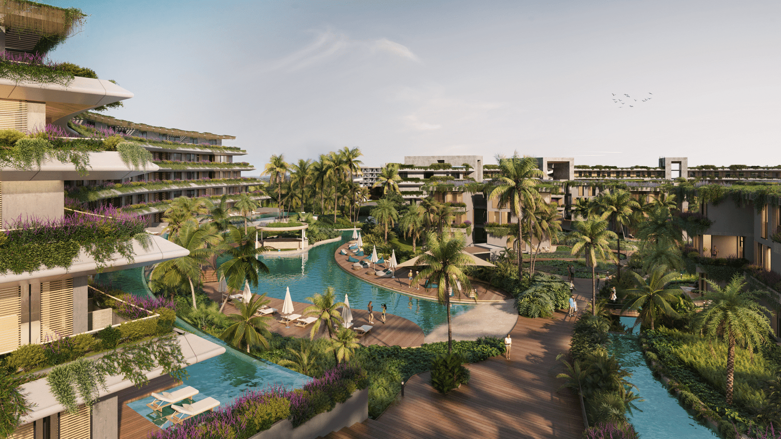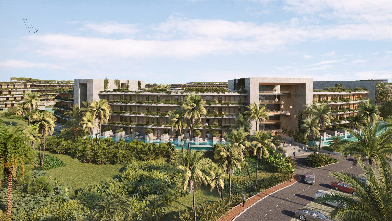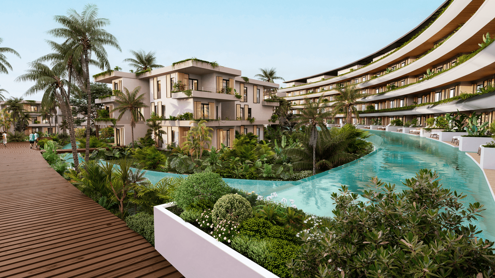 A residential project in Punta Cana made up of 540 apartaments with 1,2 and 3 bedrooms, overlooking a majestic pool tthat interconnects all the buildings, has BBQ area and tropical gardens.